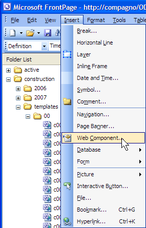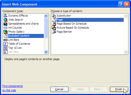 Fig. 1-2 Insert Included Content component and Page content typeAfter choosing the location on a web page where the ClustrMap component is to be inserted, select Insert | Web Component on the FrontPage 2003 menu (fig. 1-1).